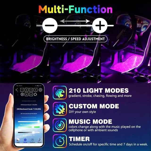 - DIY your own lighting style with different colors, sequences and changing modes.