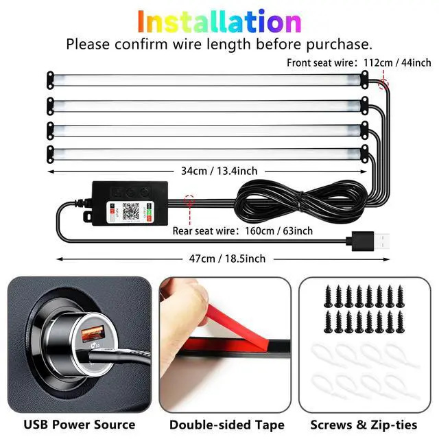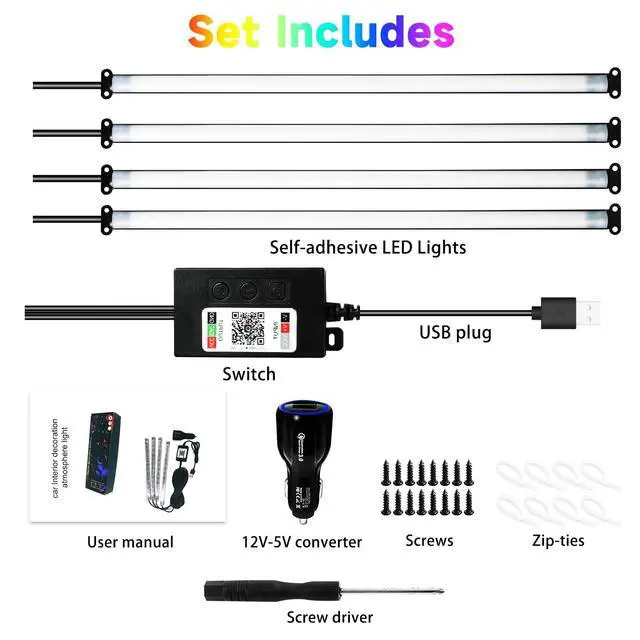 LED light strips x 4, 12V converter x 1, zip-ties x 8, screws x 16, screw driver x 1, user manual x 1.