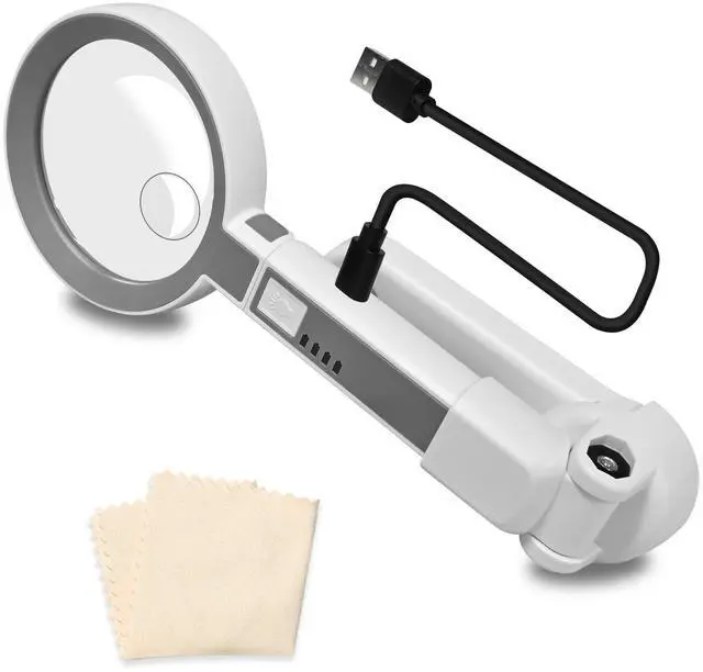 The LED lights feature multiple brightness level options, and the folding stand design facilitates hands-free use. Additionally, the magnifier supports USB charging (with built-in rechargeable lithium battery) and features measurement marks on the stand, with its compact design enabling easy storage.