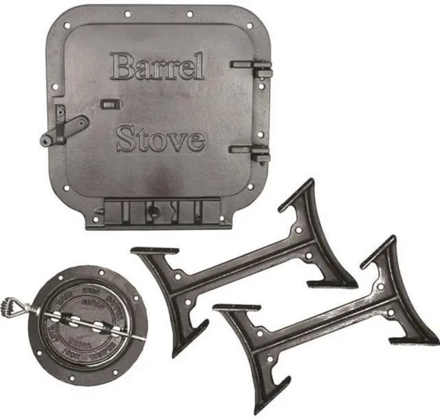Vogelzang barrel stove kit, 6 in round flue collar, 10 x 11 in door opening, 2 pieces, includes: (1) legs, door, (1) flue collar with damper and all mounting hardware, suitable for use with: 30 or 55 gal steel drum, for rustic cabin, pole barn or workshop