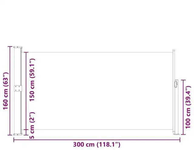 This simple yet stylish side awning provides privacy and creates a cozy place. It also helps to protect against the wind and low-lying sun. The screen is made of UV resistant, tear resistant polyester. The cassette is installed on a wooden pole in the vertical position, and the retractable awning is pulled straight out. The width of the awning is adjustable to up to 118". The awning also has automatic roll-back function. Delivery also includes mounting accessories.