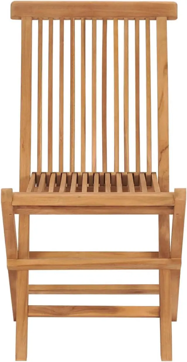 vidaXL Folding Garden Chairs 2 pcs Solid Teak Wood - 41993, This teak folding chair, featuring a simple yet elegant design, will bring you a comfortable seating experience. Constructed from extremely durable teak hard wood, this piece of teak furniture has been seasoned, kiln dried and then fine sanded to give a very smooth appearance. Teak wood is known for its exceptional strength and weather resistance, making it far more suitable for garden furniture than any other kind of wood. Teak wood is the perfect choice if you want to purchase a long lasting piece of garden furniture. The sanded surface is easy to clean with a damp cloth. They are also lightweight, which makes them completely flexible and easy to move around. In addition, the wooden chair can be easily folded away when not in use. The product is applied with beautiful finish to give the wood a warm color. Delivery includes 2 folding chairs.Product Dimensions : 18.5" Wx 23.6" Dx 35" H. Seat depth: 14.6". Seat height from the ground: 18.1".