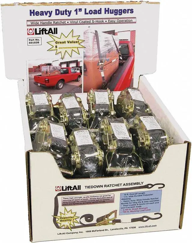 Tie Down Strap, Working Load Limit 700 lb, Color Black, End Type S-Hook, Tensile Strength 2, 100 lb/in, Tie Down Material Polyester, Overall Width 1 in, Reinforcement Properties Not Applicable, Fixed End Length 18 in, Overall Length 15 ft, Standards CVSA, FMCSA, US DOT, Adjustment Type Ratchet, Manufacturers Warranty Length Not Applicable, End Material Steel, Product Type Tie Down Strap, Package Quantity 16. This item has been restricted from sale in the following state (s): []