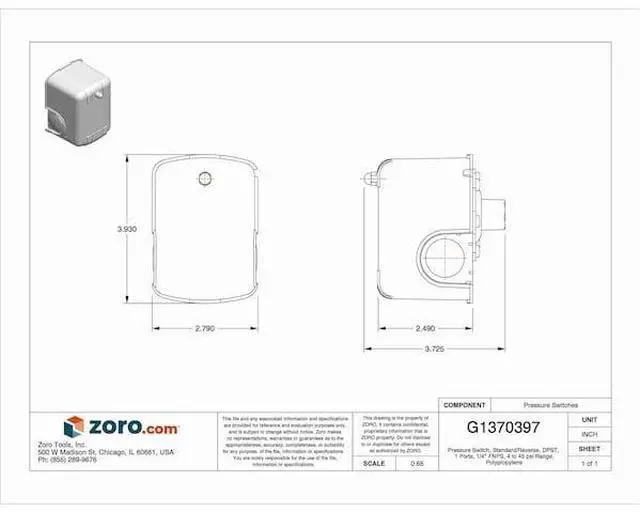 Water Pump Switch, Water Pump, Manual Switch Action None, (1) Port, 1/4 in FNPS, Pressure Switch Factory On/Off Setting 10/5 psi, No Pressure Switch Unloader, Pressure Switch Differential 6 to 20 psi, Pressure Switch Range 4 to 45 psi, Pressure Switch Electrical Contact Form DPST, Pressure Switch Action Reverse, NEMA Rating 1, Series 9013FR, HP @ 1 Phase - 120V 1 hp, HP @ 1 Phase - 240V 1 hp, HP @ 3 Phase - 240V 1 hp, Temp. Range -22 Degrees to 257 Degrees F.
