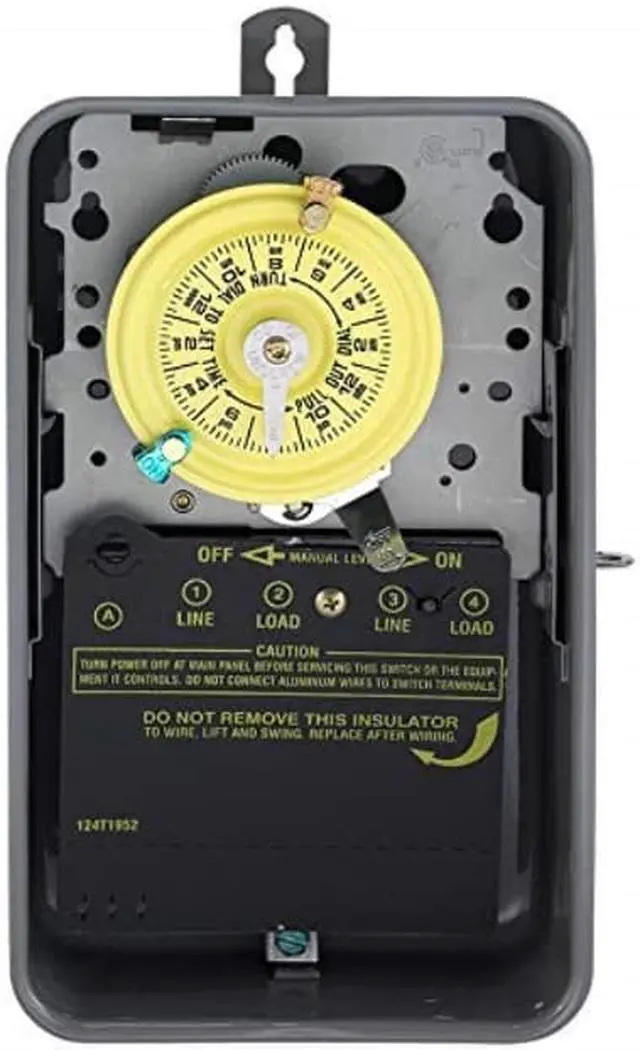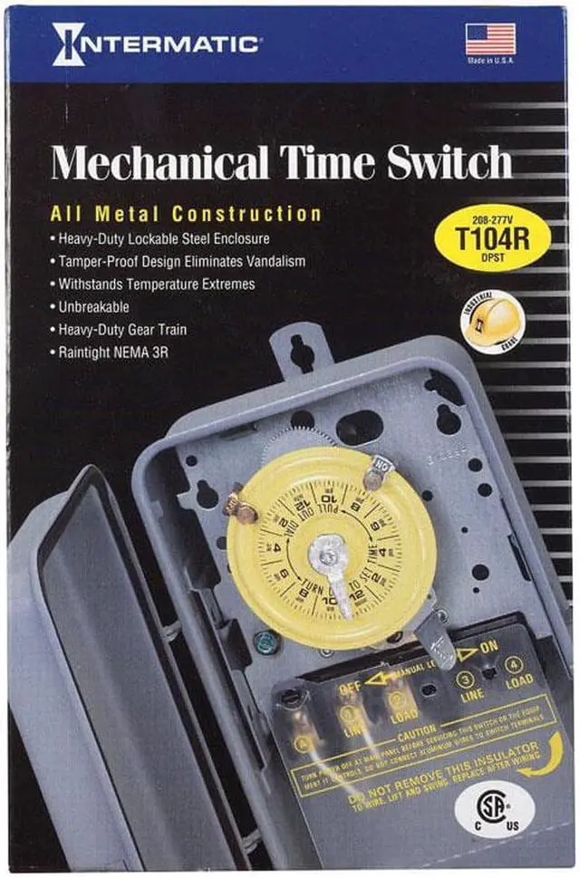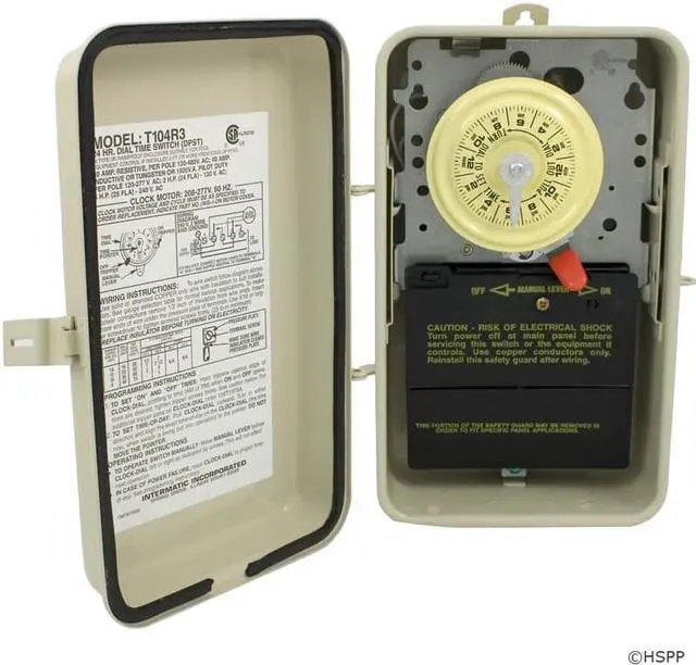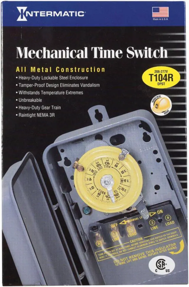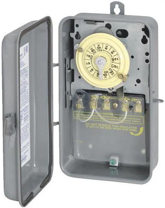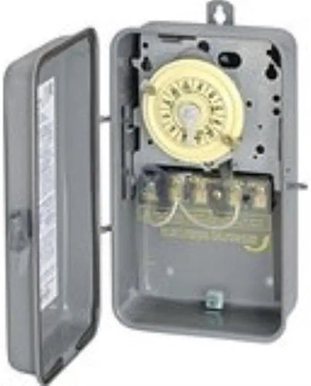 Electromechanical Timer, 24-Hour, Number of Poles 2, Contact Form DPST, Voltage 208 to 277V AC, Amps 40 A, Contact HP @ 120V 2 hp, Contact HP @ 240V 5 hp, Day Skipper No, Enclosure Type Steel, Finish Metal Enclosure has Gray Enamel, NEMA Rating 3R, Min. Time Setting 1 hr, Max. Time Setting 23 hr, Max. On/Off Cycles 12, Width 5 1/2 in, Depth 3 5/8 in, Height 9 7/16 in, Number of Trippers Included 2, Extra Trippers 2E054.