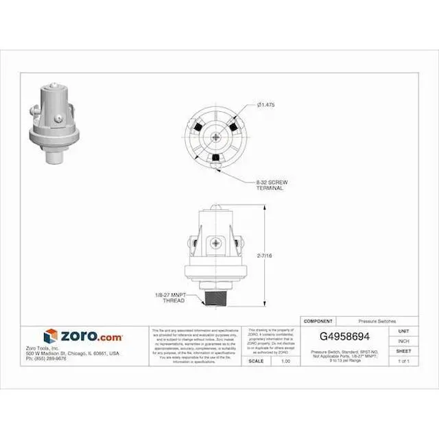 Pressure Switch, Differential 8 to 13 psi, Range 8 to 13 psi, Port Type 1/8-27 in MNPT, Contact Form 1NO, NEMA Rating Not Rated, Actuation Type Diaphragm, Action Standard, Series 5000, Factory On/Off Setting 10 psi, AC Contact Rating 0.5 A @ 240 V, 1 A @ 120 V, DC Contact Rating 15 A @ 6 V, 4 A @ 24 V, 8 A @ 12 V. This item has been restricted from sale in the following state (s): []