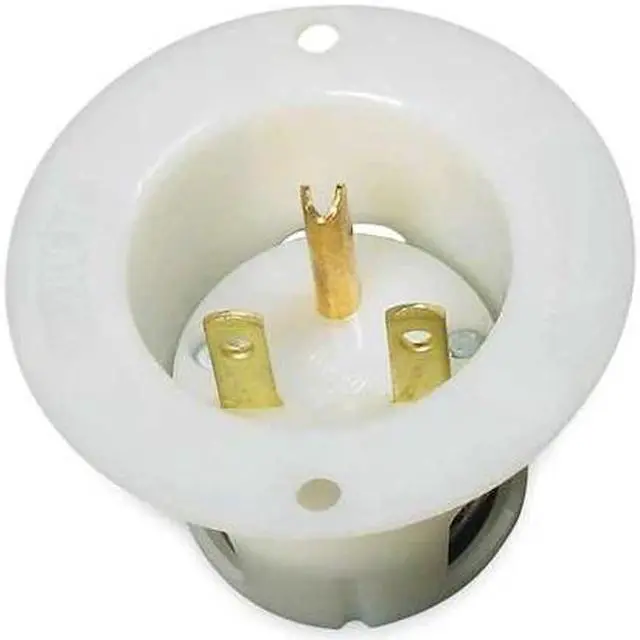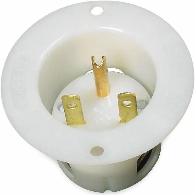 The HUBBELL Flanged Inlet is a panel mount, single straight blade receptacle suitable for use in industrial applications. Rated for 15A and 250V AC, this inlet includes a round flange; NEMA 6-15R configuration. It is housing made of thermoplastic materials and includes backwired terminations to accommodate #18-#10 AWG copper conductors. The device is equipped with screw terminals for grounding and comes with mounting screws for installation.