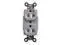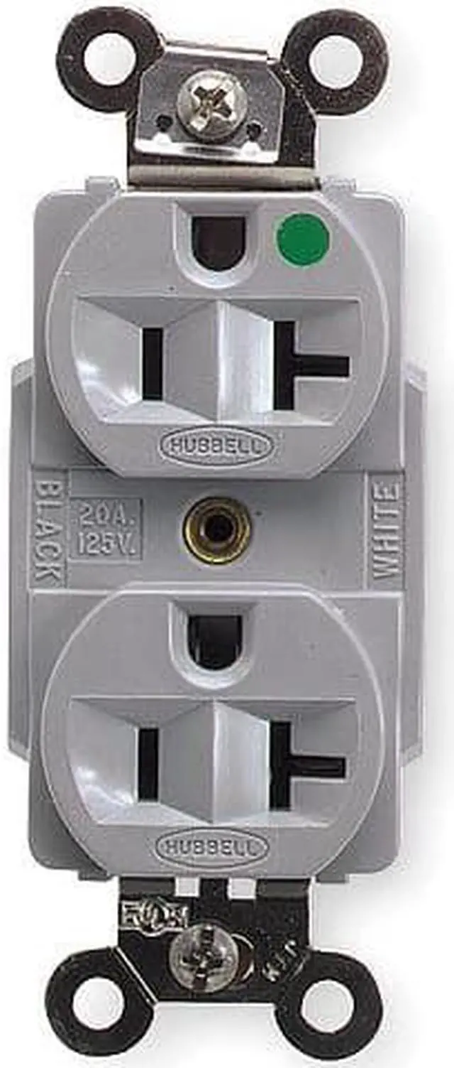 The HUBBELL 20A Duplex Receptacle 125VAC 5-20R GY is a Hospital grade electrical receptacle rated for use in specified applications. This duplex outlet features a deep body with an impact resistant thermoplastic polyester face and is rated for 20 amps at 125 volts AC. It includes both back and side wired screw terminals to accommodate #12#10 AWG copper wire, supporting flexible installation options in flush mount applications.
