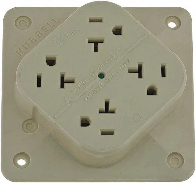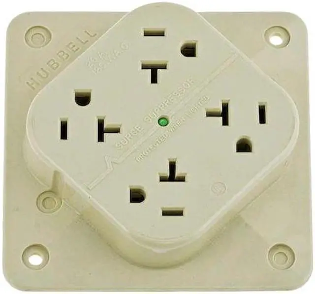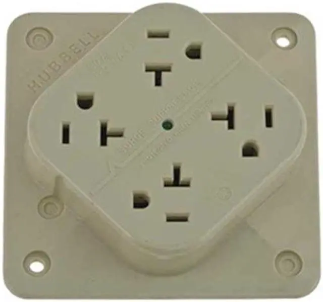 The HUBBELL 4-Outlet Quad Surge Suppression Receptacle is a surface-mount electrical receptacle suitable for use in indoor commercial settings where multiple outlets and surge suppression are needed. Rated for 20A and 125V AC, this quad outlet features NEMA 5-20R configuration with straight blade connections and terminal screw wiring. The device includes MOV-based surge suppression rated at 80 joules/6500A per mode, providing up to 240 joules of protection per mode, along with LED indicators for status monitoring.