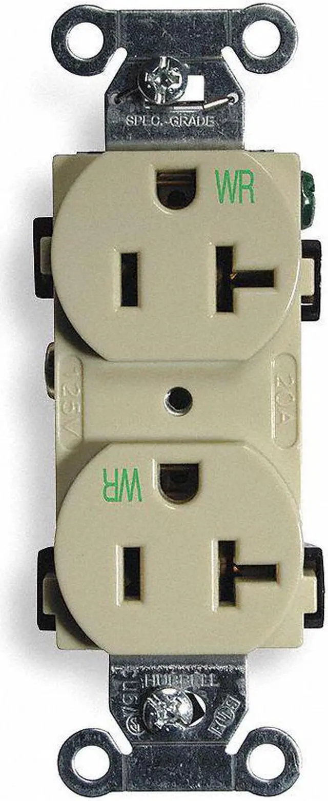 Receptacle, Straight Blade, Commercial Application Environment, Amps - Plugs and Receptacles 20 A, 5-20R, 125V AC, Number of Poles 2, Number of Wires 3, Tamper Resistant No, Weather Resistant - Plugs and Receptacles Yes, Outlet Type - Plugs and Receptacles Standard Duplex, Mounting Type - Plugs and Receptacles Flush, Ivory, Wiring Method - Plugs and Receptacles Back and Side, Surge Suppression No, Material Nylon, Phase 1, HP 1 hp, Corrosion Resistant No, Power Indicator No. This item has been restricted from sale in the following state (s): []