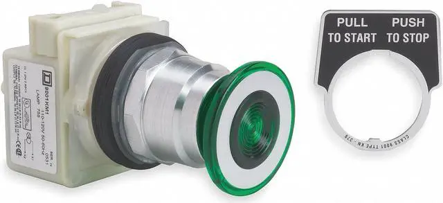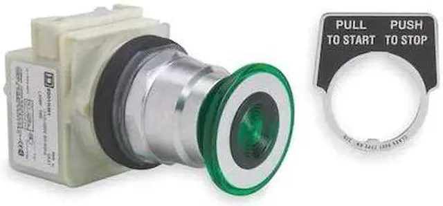 Mushroom Head Push Button, 30 mm, Momentary, Type of Operator 40mm Mushroom Head, Basic Material Metal, Head Material Metal, Bezel Material Metal, Color Green, NEMA Rating 1, 12, 13, 2, 3, 3R, 4, 6, IP Rating IP66, Legend Pull To Start, Push To Stop, Legend/Background Color White/Black, Standards REACH Free of SVHC, RoHS. This item has been restricted from sale in the following state (s): []