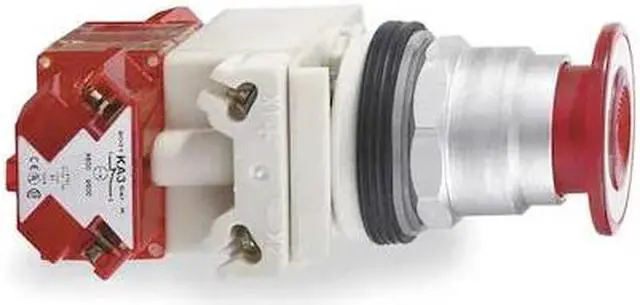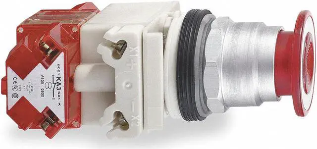 Mushroom Head Push Button, 30 mm, Momentary Action, 41mm Mushroom Head Type of Operator, Head Material Plastic, Contact Form 1NC/1NC, Bezel Chrome Die Cast Aluminum, Color Red, Contact Rating 10A @ 120V AC, Number of Operators 1, NEMA Rating 1, 12, 13, 2, 3, 3R, 4, 6, IP Rating IP20, IP65, Legend Pull to Start/Push to Stop, Standards CE, CSA LR25490 Class 3211 03, REACH, RoHS, UL E42259 CCN NKCR, WEEE, Terminal Connection Screw Clamp, Features Self-Grounding, Finger-Safe Terminals.