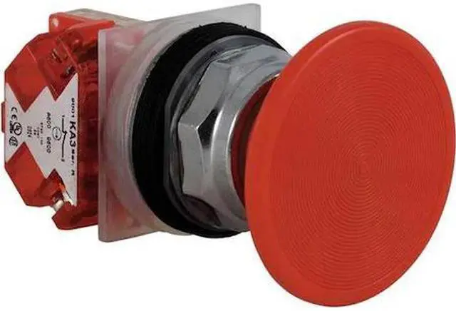 Mushroom Head Push Button, 30 mm, Momentary Action, 57mm Mushroom Head Type of Operator, Head Material Plastic, Contact Form 1NC, Bezel Chrome Plated Zinc Die Cast, Color Red, Contact Rating 10A @ 600V AC, NEMA Contact Rating Designation A600/Q600, Number of Operators 1, NEMA Rating 1, 12, 13, 2, 3, 3R, 4, 6, IP Rating IP66, Legend Not Applicable, Standards CE, CSA LR25490 Class 3211 03, REACH, RoHS, UL E42259 CCN NKCR, WEEE, Terminal Connection Screw Clamp, Material Metal.