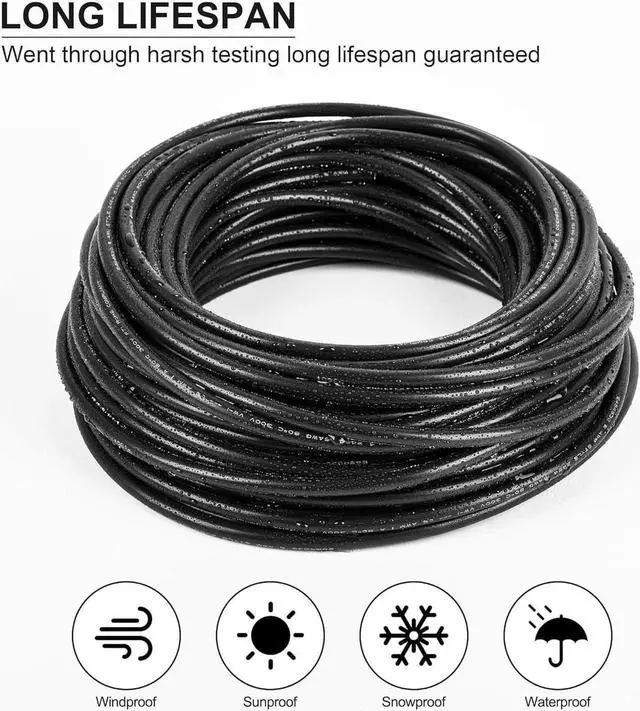 The high quality copper wire has a black outer sheath is very soft and protects the wire from abrasion and is resistant to the effects of sunlight and chemicals. Rated to work at temperatures up to 80°C/176°F.