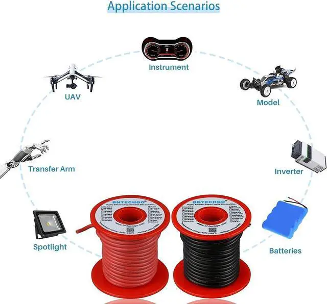 BNTECHGO silicone wire are widely used for model planes, model cars, model ships, lamps, household appliances, electric heating appliances, meters, instruments, motor and digital fields.