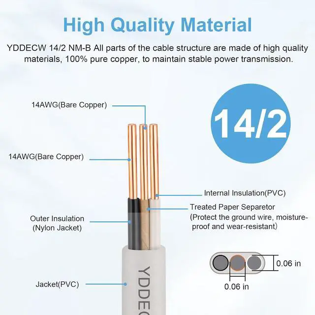 Pure Copper Conductor]: Crafted with high-purity bare copper conductors, our NM-B wire ensures excellent electrical conductivity and minimizes power loss. It is manufactured to meet the stringent requirements of the National Electrical Code (NEC) for Type NM-B cable, ensuring reliability and performance for your residential wiring projects.