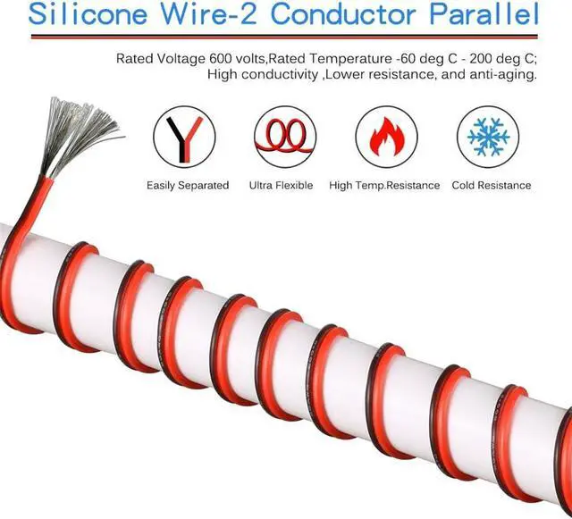 Package Included: 25 feet 20 gauge red black 2 conductor parallel silicone wire. Also available 8 gauge, 10 gauge, 12 gauge, 14 gauge, 16 gauge, 18 gauge, 20 gauge, 22 gauge ultra Flexible 2 conductor parallel silicone wire.