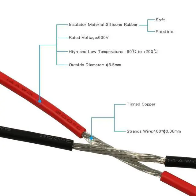 High strand count copper core, 14 AWG silicone stranded wire has 400 strands 0.08 mm tinned copper wire, the copper strands are tinned, protecting them from corrosion and making it easier to solder.