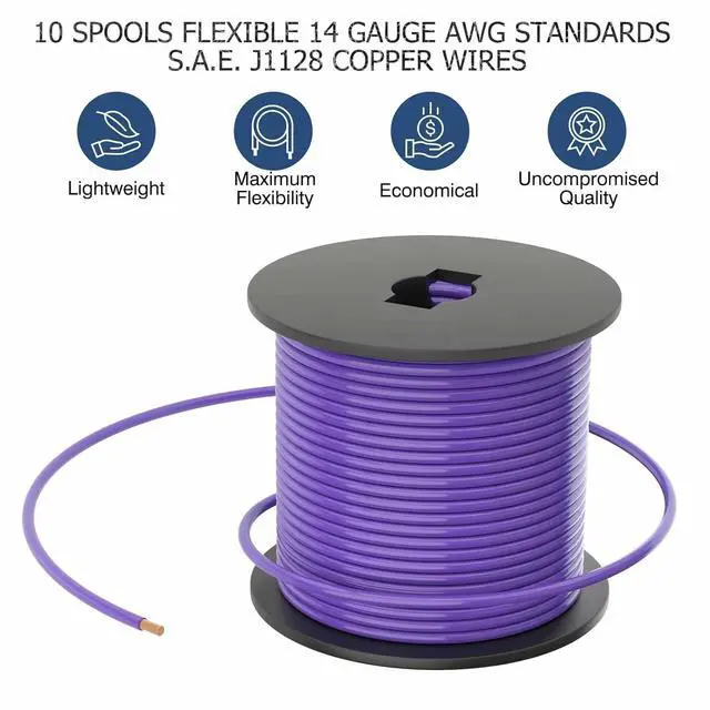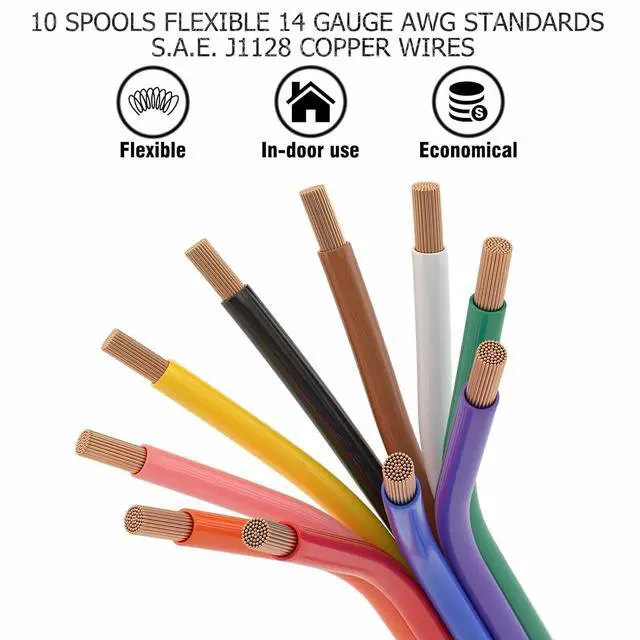 EASY TO DISTINGUISH Our 10 color automotive primary wire Spools (white/black/red/blue/green/yellow/brown/purple/orange/pink. ) are the same length and gauge, 100ft and enough 14Gauge. SUZCO' s 14-gauge wire is ideal for a variety of applications, including unique projects, original equipment, or replacement.