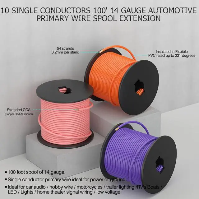COPPER-CLAD ALUMINUM MATERIAL10-color Single Conductors core copper clad aluminum stranded wire package with PVC insulation. The 10-spool spool is all made of high-quality stranded copper-clad aluminum material. The spool diameter is 14AWG. The total length is 1, 000 feet. Heavy-duty 14AWG wire is strong enough for applications up to 120W.