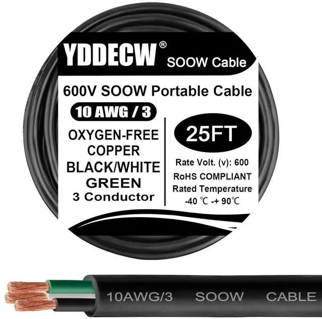 Tough Conditions: Our Heavy Duty 10 AWG 600V SOOW (Service, Oil, and Water Resistant) cable (25 FT - 3 Conductor) is the first choice for industrial, commercial, and outdoor uses. With its insulated design and robust PVC jacket, it' s built to withstand oils, acids, water, and chemicals, ensuring reliability in even the harsh environments.