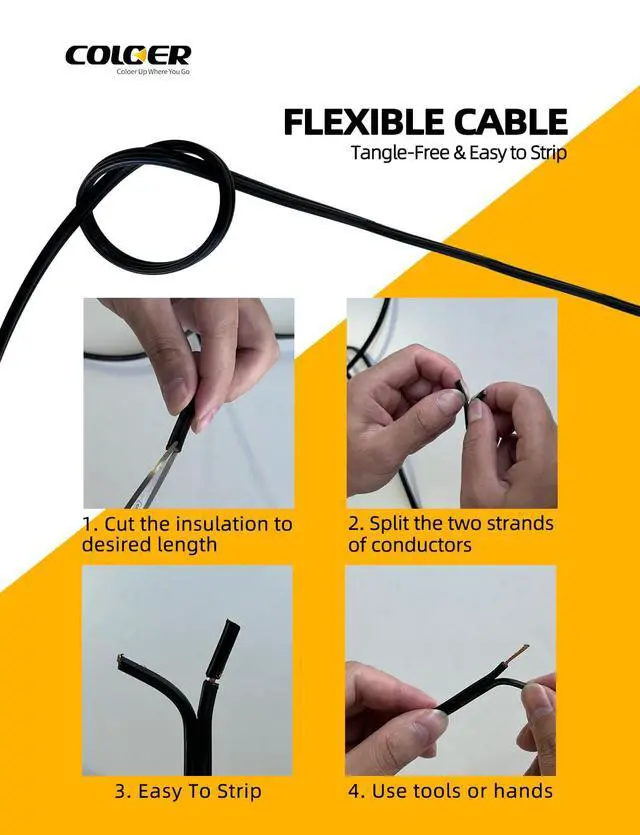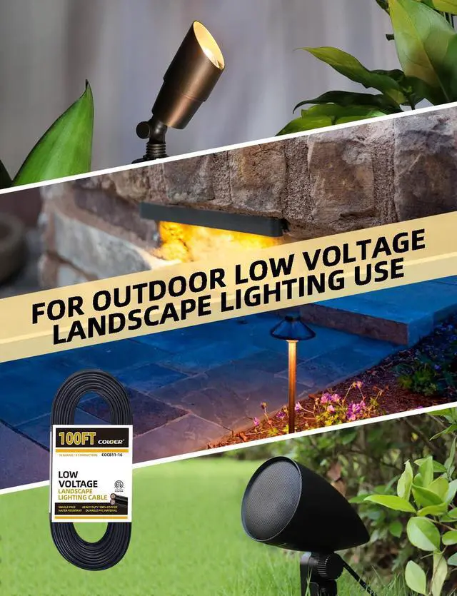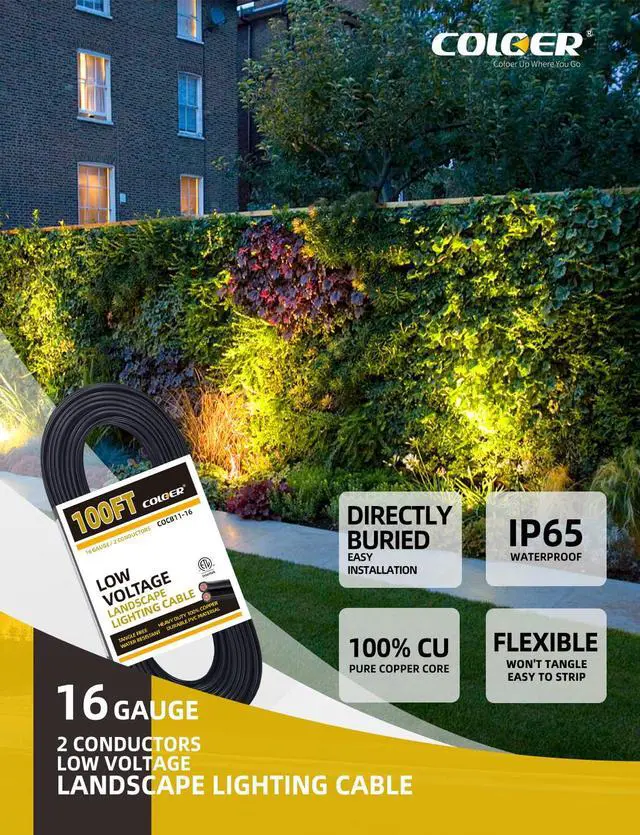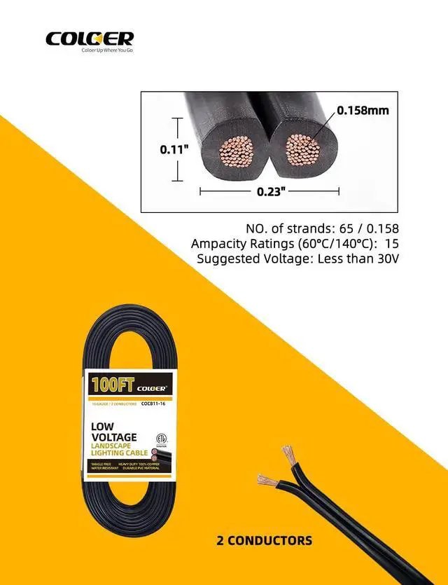 FLEXIBLE WIRE: This COLOER landscape lighting cable is 16 Gauge, 100ft featuring flexible copper wire wrapped in PVC for excellent toughness. This low-voltage 16/2 AWG wire with 65 strands is easy to strip, allowing you to confidently install your landscape lights with our cable.