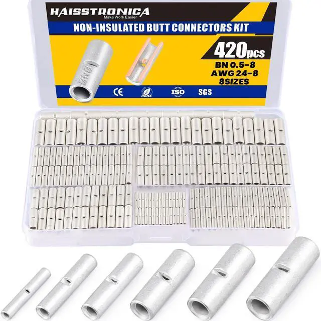 Versatile Sizes: 420pcs non-insulated butt connectors in a box, including 6 different sizes (AWG24-8), from small gauge wires to larger ones, these connectors can handle it all