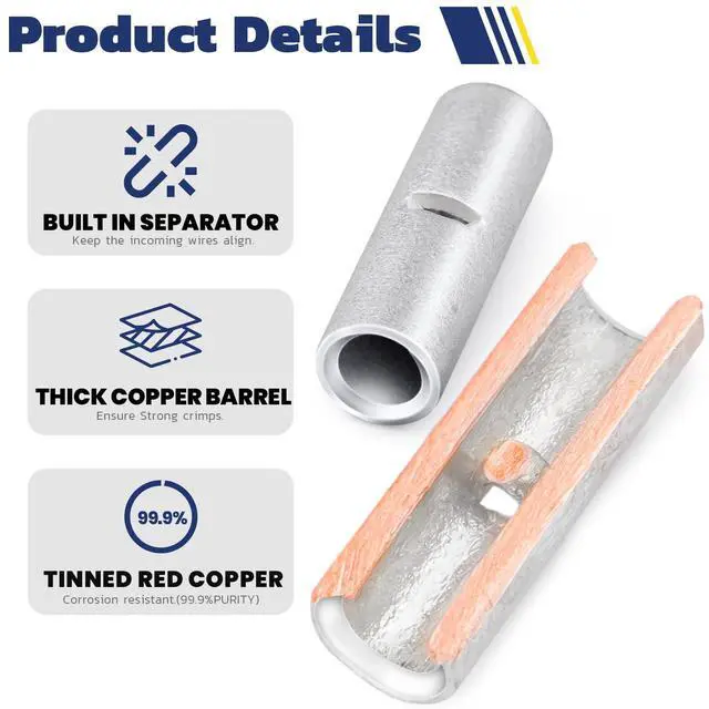 Excellent Conductivity: Made from pure copper, these butt connectors offer excellent conductivity for efficient and reliable electrical connections