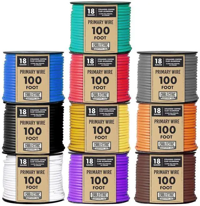 HEAT RESISTANT - These primary wires are heat rated to 221°F / 105°C. Each roll contains 100 feet of 18 gauge, single conductor wire per roll. Core is stranded copper clad aluminum. 0.2 mm dia/strand, 26 strands. Not for use in building and household 110 / 220 V AC wiring.