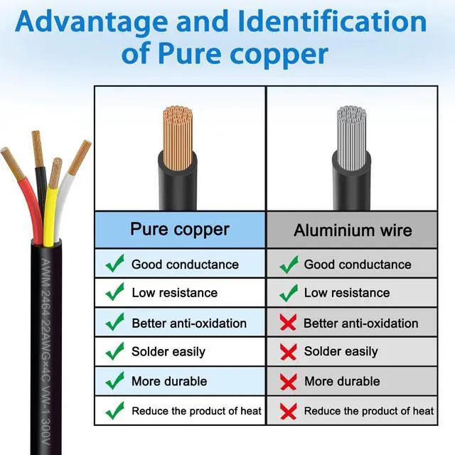 Easy to use22/4 gauge wire: High purity oxygen-free Stranded copper, Compared with CCA (copper clad aluminium) and Pure Copper materials, specification features high conductivity, low resistance, easy to welding, connect, cut and Separate.