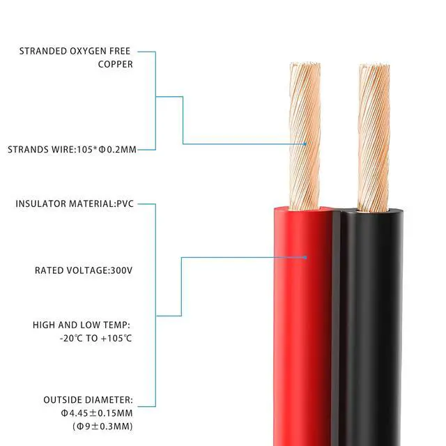 Widely used105 strands of 0.2 mm oxygen free copper wire are inside each cable - Highly efficient - Super low impedance for a highly efficient connection, suitable for outdoor, energy storage deviceslighting systemsautomotive applicationshousehold circuit systems and other daily environmentssuch as led lamps strips lighting outdoor speaker automotive landscape lighting marine batteries solar panel.