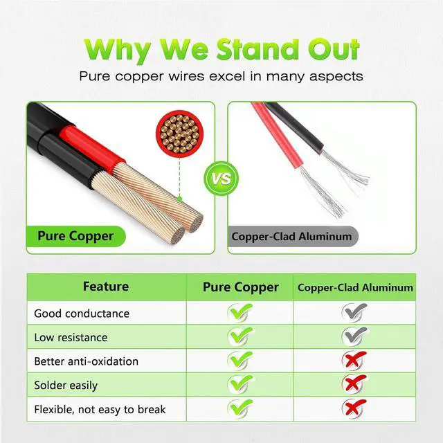 Pure Copper for Superior Performance This 2-conductor 18 AWG wire offers exceptional conductivity and lower resistance compared to CCA(Copper-Clad Aluminum), ensuring more efficient power transfer and longer-lasting reliability for all your electrical needs