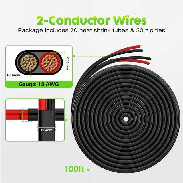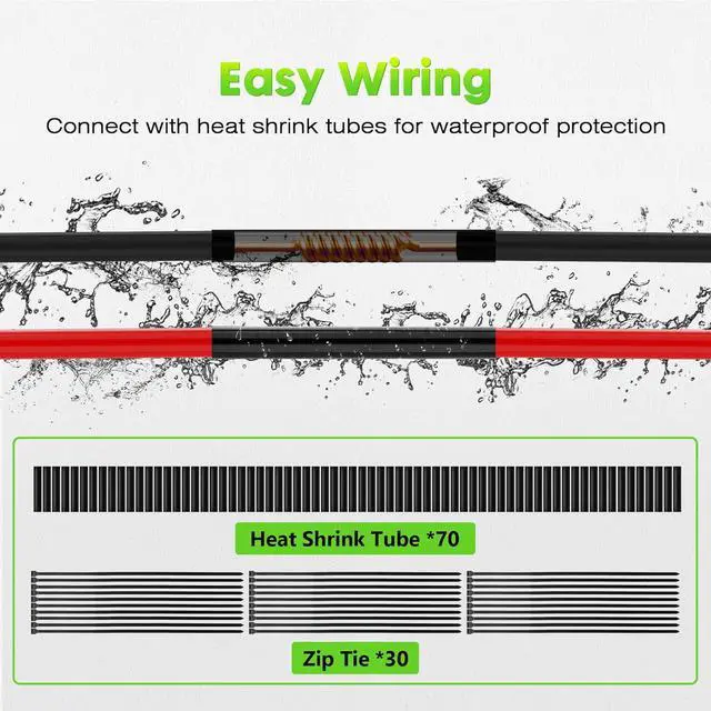 Easy to Use & Customize With a generous 100ft length, this wire is easy to strip and cut to any desired length. Plus, it comes with 70 Heat Shrink Tubes and 30 Zip Ties to enhance insulation and streamline installation