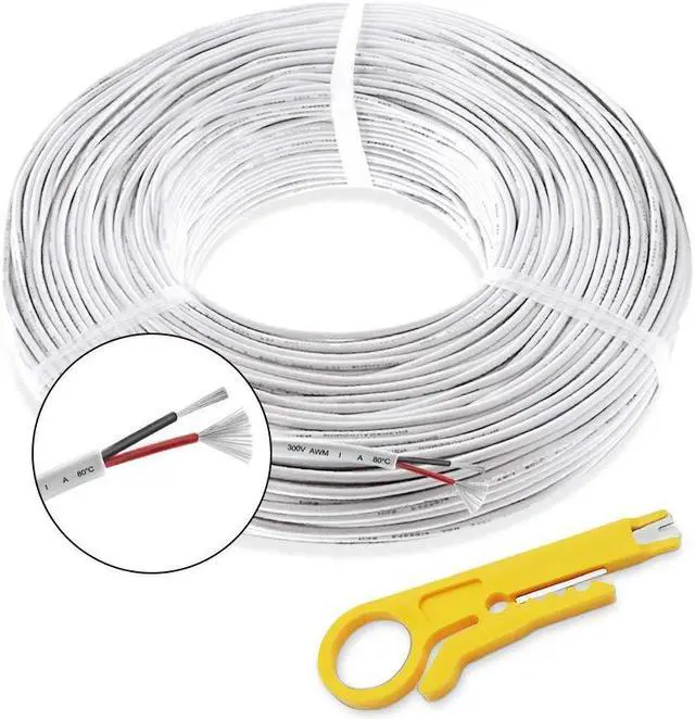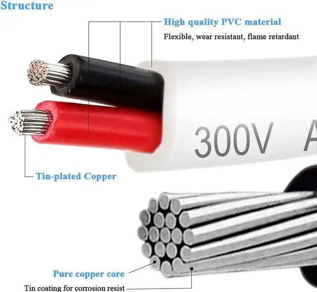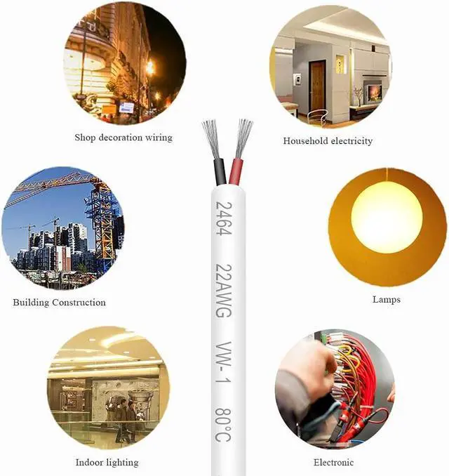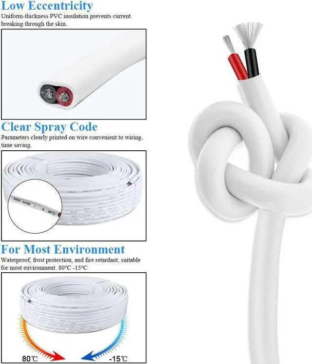 Eco-friendly PVC22AWG insulated with eco-friendly and odor-free white PVC material, is very tough, and also offers some resistance to damage from UV. The inner insulation on the conductors is color coded (red and black) to help insure your connection with proper polarity. With good insulation of inner and outer PVC jacket, wire wouldnt burn after leaving the open flame.