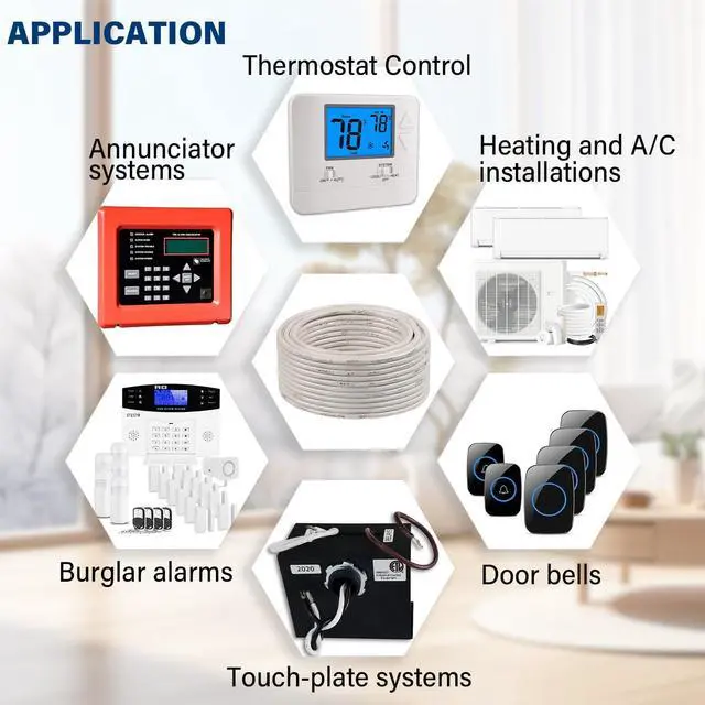 [Applications] - Our thermostat wire is used for thermostat control, heating and A/C installations, annunciator systems, doorbells, ouch-plate systems, door bells, remote controls, signal systems and other low-voltage applications.