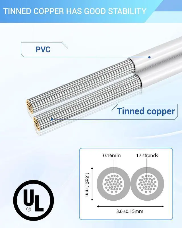 HIGH CONDUCTIVITY: 22 gauge garage wire made of 17 strands high-purity oxygen-free tinned copper, per cable 0.16 mm, 80 high temperature resistance, with excellent electrical conductivity, low resistance and ultra-low eccentricity