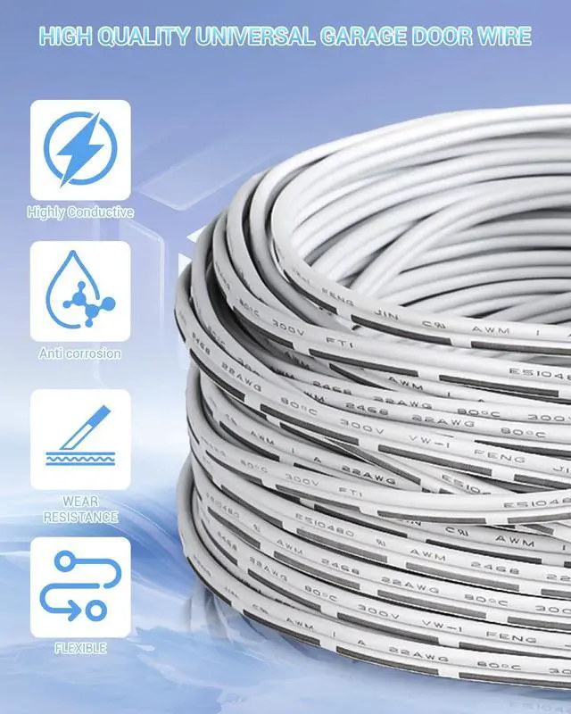 SAFETY CERTIFICATION: 22 gauge 2 conductor universal garage door wire has passed UL 2468 certification and VW-1 flame retardant rating maximum 300V working voltage, Suitable for various garage door sensor, Control station and bell wires installations