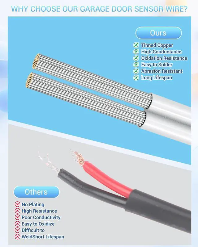 EASY TO USE: 22 awg garage door sensors wire can be easily stripped by cutting, The flexible wire body is suitable for various scenarios, Use it as an doorbell wires or extension cable, Waterproof, Anti-corrosion it can be exposed to sunlight for a long