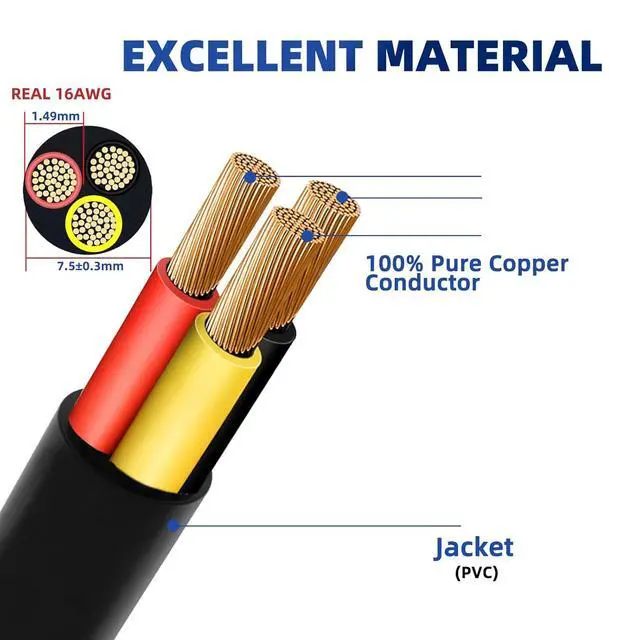Real 16AWG & Exact Wire Length: Our conductor OD is 1.49 mm that beyonds UL standard of 16AWG OD 1.29 mm, Insulation OD 2.30 mm± 0.1 mm, Insulation minimum average thickness 0.39 mm, outer jacket OD 7.5 mm± 0.3 mm. We guarantee that the our wire length is exact same as we described.