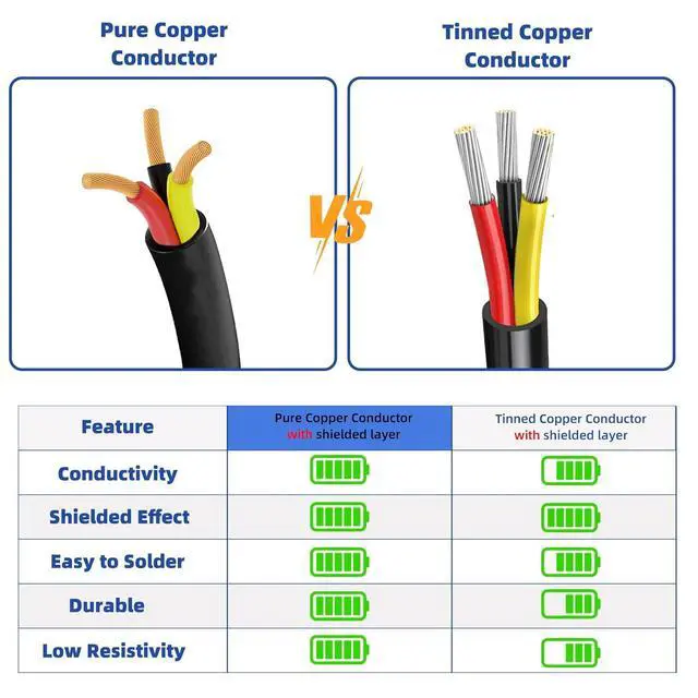 Superior Conductivity: There are 42 strands of 0.2 mm pure copper wires inside of each conductor. The conductors are made with 100% pure oxygen-free copper for minimal resistance and maximum signal transmission, outperforming tinned copper or copper-clad aluminum materials.