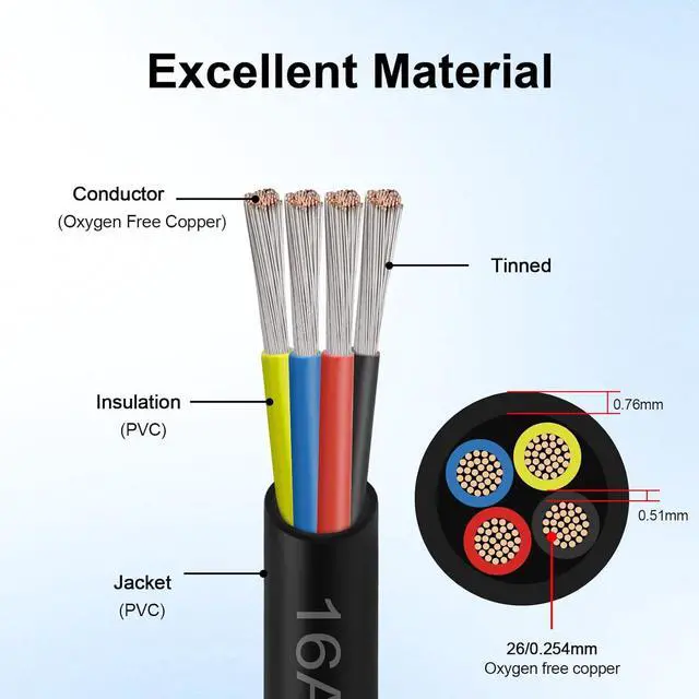 High-Performance Conductivity: Featuring 26 strands of 0.254 mm oxygen-free tinned copper per conductor, the diameter of the conductor is 2.6 mm, this 16/4 wire delivers exceptional electrical conductivity for stable and efficient power delivery. It carries 40% more current than comparable aluminum wires, providing a safer and more reliable solution for all your low-voltage applications.