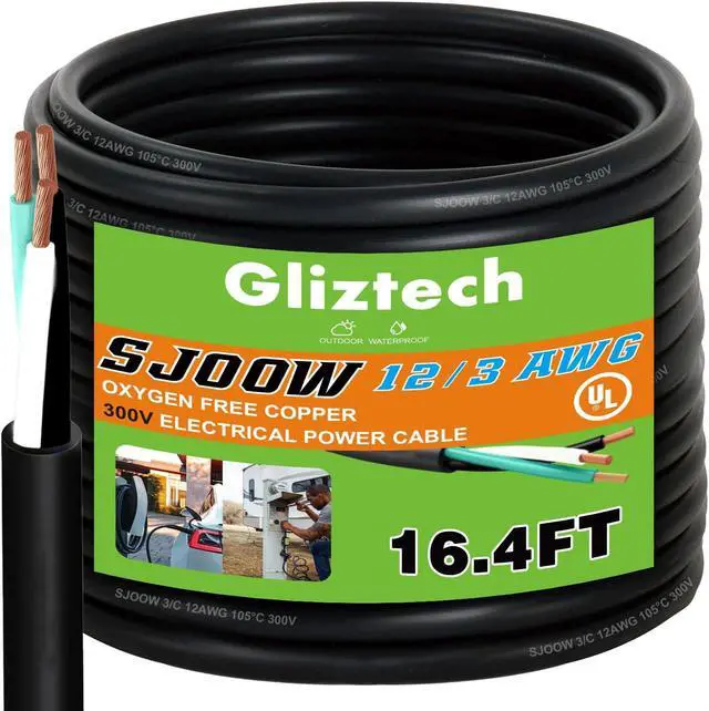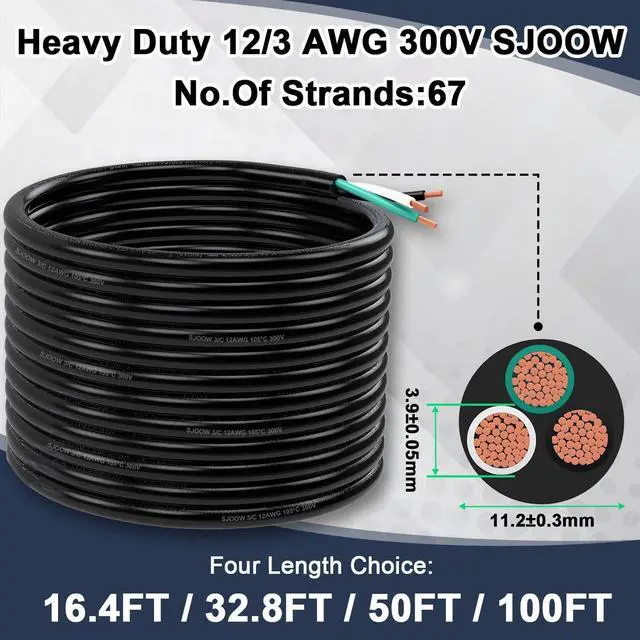 Flexible Installation: The Flexible 12/3 gauge heavy duty outdoor extension cord waterproof is a kind of cable for various DIY devices with good flexibility and easy cutting. The SJOOW AWG 12 3 wire cable is usually available in a variety of lengths, including 16.4 feet, 32.8 feet, 50 feet and 100 feet, you can cut the right length as needed. Please note that this cable does not have a separate ground wire, not 3+1 type wire.