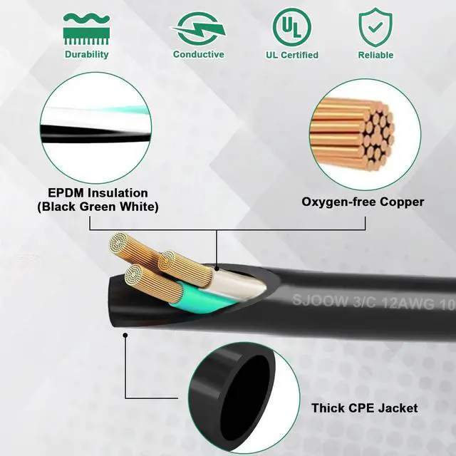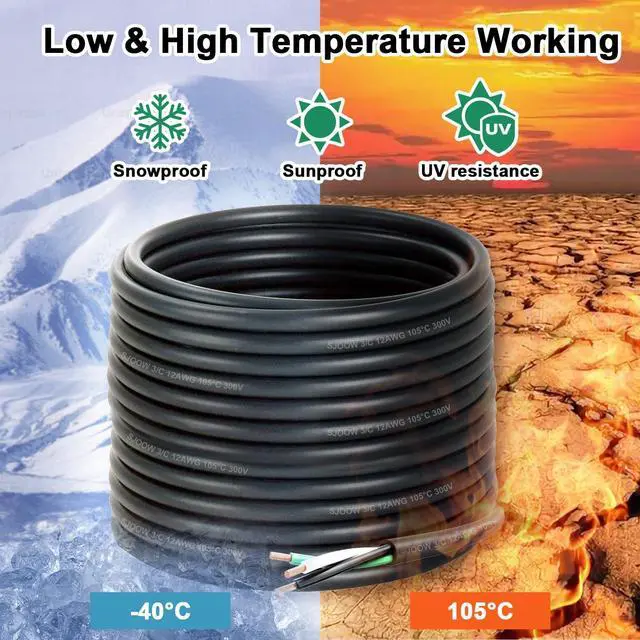 Outstanding Conductivity: The 12 gauge electrical wire is constructed from Oxygen-Free Copper (OFC), which ensures minimal current loss and exceptional conductivity, resulting in a higher current-carrying capacity. The 3 conductors are insulated with an EPDM, offering excellent heat, aging and corrosion resistance. This design guarantees stable operation under diverse environmental conditions, effectively preventing performance degradation due to fluctuations in temperature or humidity.