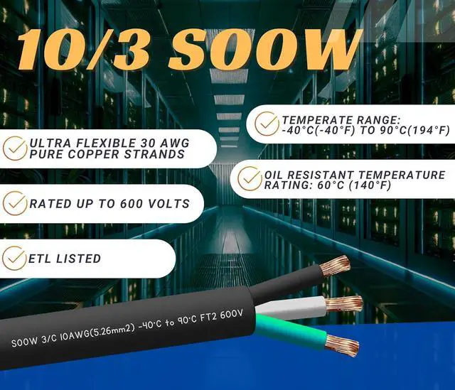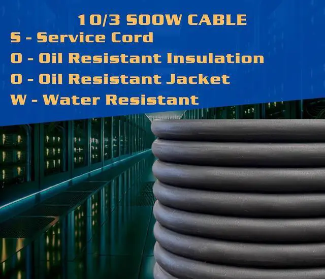 ETL approved. SOOW stands for S = Service Cord, OO = Oil Resistant (both inside and outside insulation), W = Weather and Water Resistant.