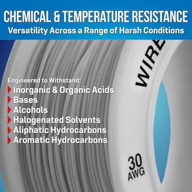 HARSH RESISTANCE: Kynar insulation provides high temperature resistance, excellent abrasion resistance, and makes the wire resistant to an extensive range of chemicals including most inorganic and organic acids, bases, alcohols, halogenated solvents, and aliphatic & aromatic hydrocarbons