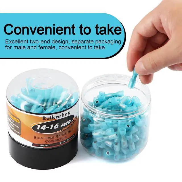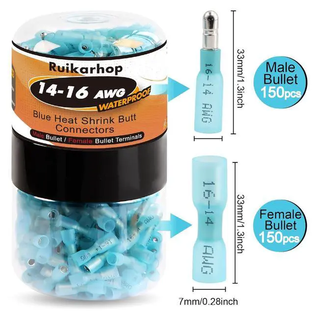 Package150PCS Male Heat Shrink Bullet Connectors, 150PCS Female Heat Shrink Bullet Connectors, and a exquisite plastic bottle.