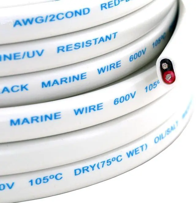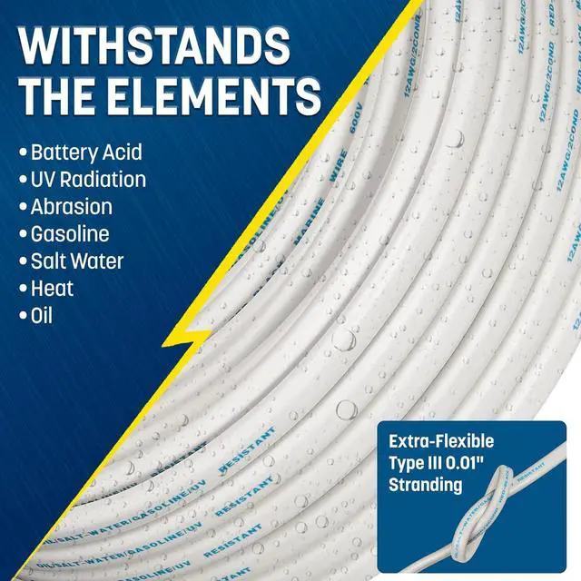This robust marine power wire resists salt water, battery acid, oil, gasoline, heat, abrasion, and ultraviolet radiation.