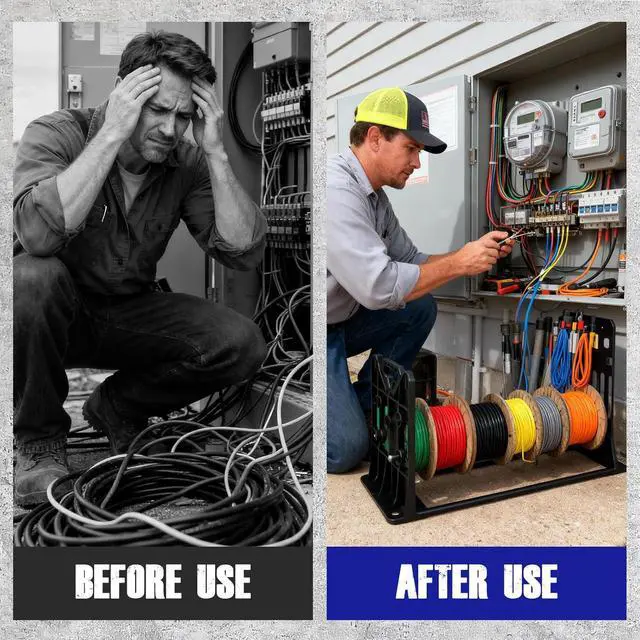 Well Built and Rugged Wire Dispenser Holder: The wire spool rack/caddy is a one-piece construction made from High-density polyethylene structural foam, which is lightweight, durable, and sturdy, and can withstand extended periods of use and a variety of working conditions. Its load Capacity is up to 330 LBS. Simple but effective Tools or any electrician.