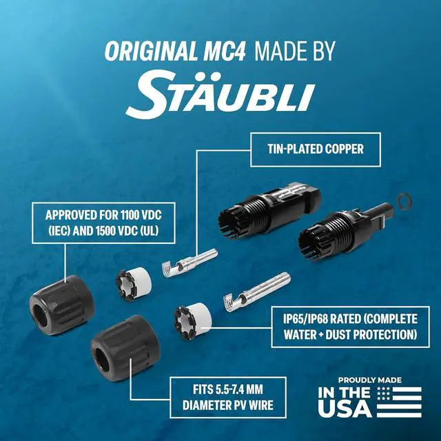 Staubli MC4 Connectors are IP65/IP68 rated Secure, waterproof connections built for outdoor use