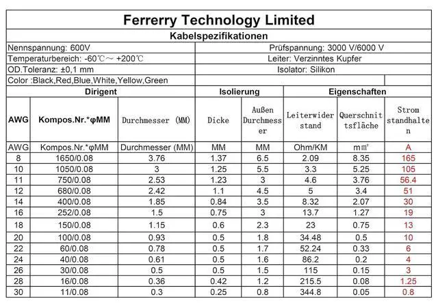 SPECIFICATIONS -silicone Wire 18 AWG Hook-Up Wire is made of 150 strands 0.08 mm silicone tinned copper conductor with a silicone sheath, withstand current 13A, OD= 2.3 mm; 600 volts voltage rating, Silocone Insulation that can withstand heats of up to 200 degree C.